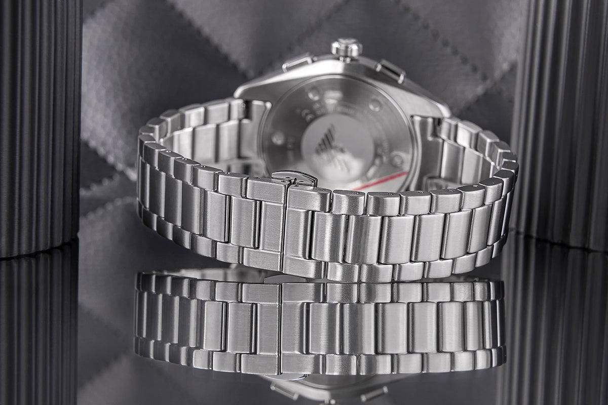 Srebrna bransoletka wykonana z doskonałej szczotkowanej stali nierdzewnej do elementu, który nie jest przeoczony. Poszczególne elementy rozkładu tak, przez całość układać się na nadgarstku, dając jednocześnie dodatkowy komfort. Nieprzesadzona, chłodna w dotyku, wyrafinowana i solidna - jest jak stalowa obręcz, która trzyma zegarek na poziomie nadgarstku, wzmacniacz Ci o trwałości. Poszczególne ogniwa są dokładnie dopracowane, dzięki czemu każdy element jest odpowiednio dobrany, jak i formalnych stylizacji. Precyzyjnie wykonane zapięcie dopełniające dziesięć wytrzymałych, męskich zegarków o charakterze.