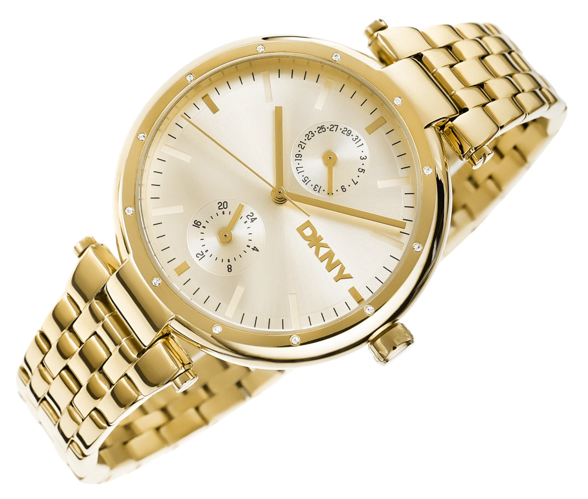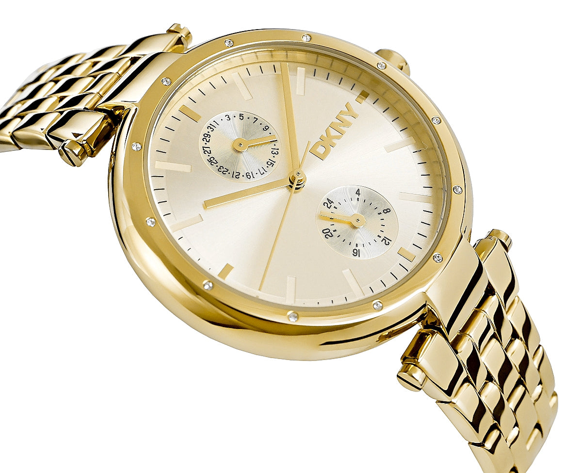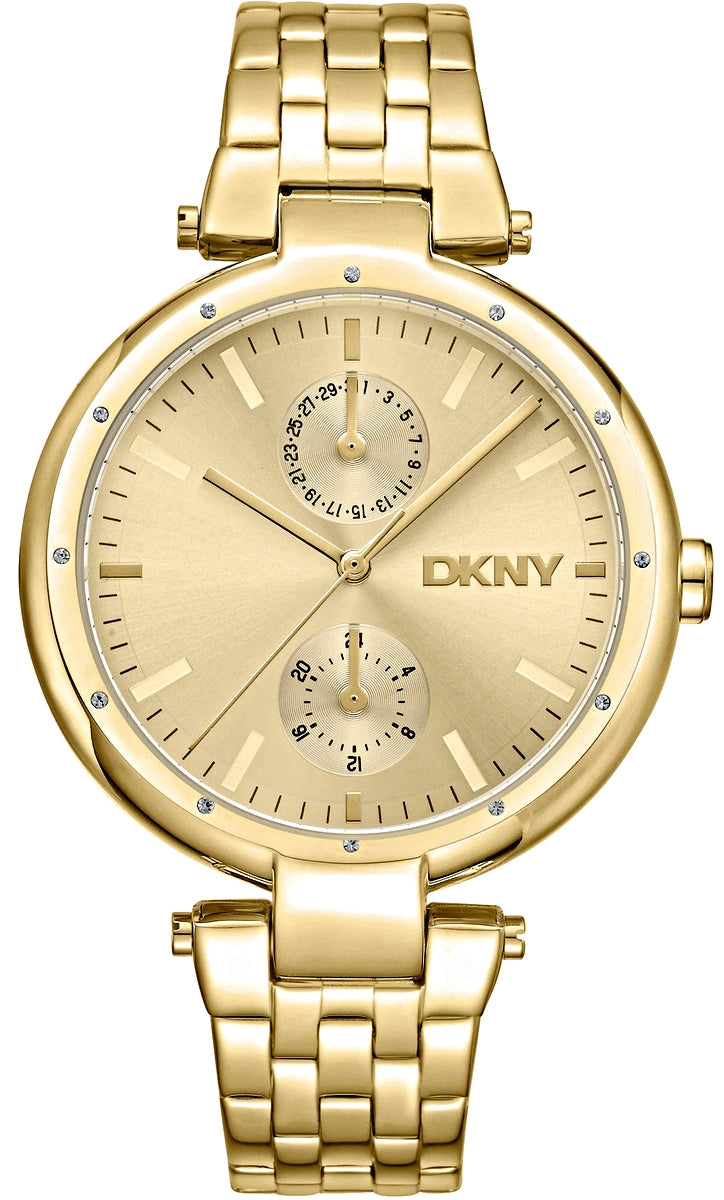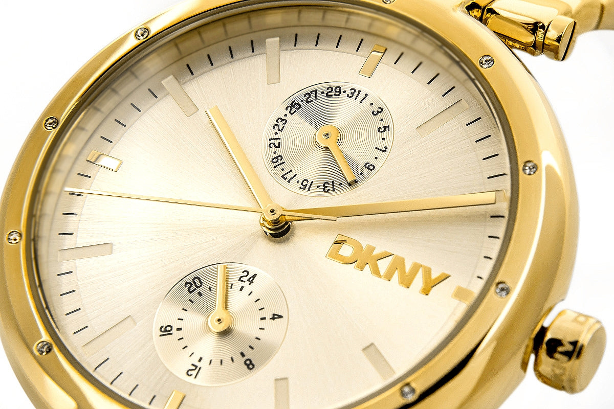 Zegarek DKNY to kwintesencja elegancji i nowoczesnego stylu, który łączy w sobie luksus i subtelny minimalizm. Złota koperta i dopasowana bransoleta tworzą spójną, wyrafinowaną całość, przyciągając uwagę swoim blaskiem. Tarcza w złotym odcieniu, ozdobiona subtelnymi kryształkami i trójwymiarowym logo DKNY, dodaje mu głębi i unikalnego charakteru. To nie tylko zegarek – to biżuteryjny akcent, który dopełni zarówno codzienne, jak i eleganckie stylizacje.