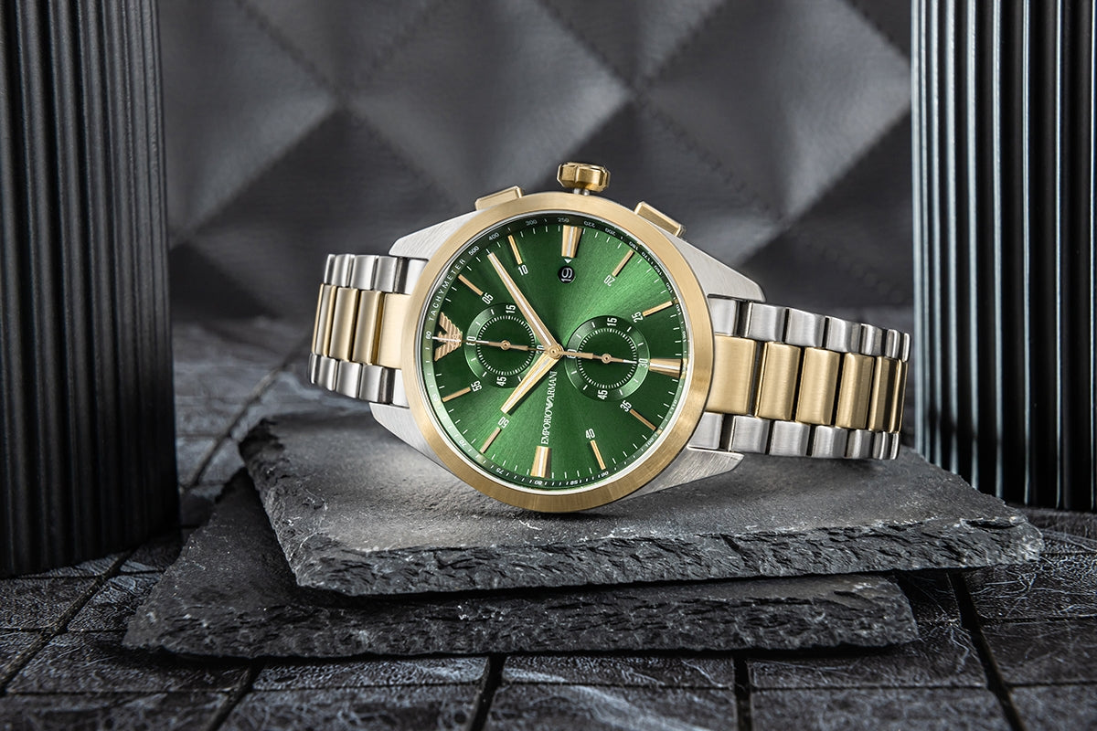 Zegarek Emporio Armani Claudio AR11511 to idealne połączenie elegancji, nowoczesności i funkcjonalności. Zaprojektowany z myślą o mężczyźnie, który ceni styl i precyzję, przyciąga uwagę swoim wyrafinowanym wyglądem i dopracowanymi detalami. Koperta o średnicy 42 mm wykonana ze stali szlachetnej w kolorze srebrnym nadaje mu charakteru i męskiej siły, a zielona tarcza o promienistym wykończeniu typu sunray subtelnie zmienia odcień w zależności od kąta padania światła, tworząc efekt głębi i elegancji. Na tarczy umieszczono subtarcze chronografu oraz datownik, które nie tylko dodają zegarkowi sportowego akcentu, ale także zwiększają jego funkcjonalność. Wskazówki i indeksy pokryte warstwą luminescencyjną zapewniają czytelność w każdych warunkach. Sercem zegarka jest niezawodny mechanizm kwarcowy chronograf, który gwarantuje precyzyjne odmierzanie czasu bez potrzeby nakręcania. Całość chroni trwałe szkło mineralne o podwyższonej odporności na zarysowania, a wodoszczelność na poziomie 5 ATM pozwala na bezpieczne użytkowanie zegarka na co dzień – podczas mycia rąk, w deszczu czy lekkiego kontaktu z wodą. Stalowa bransoleta w kolorze srebrno złotym idealnie dopełnia projekt, zapewniając wygodę i nowoczesny wygląd, a zapięcie typu motylkowego dodaje elegancji i ułatwia zakładanie. Emporio Armani Claudio AR11511 to zegarek dla mężczyzny, który pragnie podkreślić swój styl, pewność siebie i zamiłowanie do klasy premium w każdym detalu.