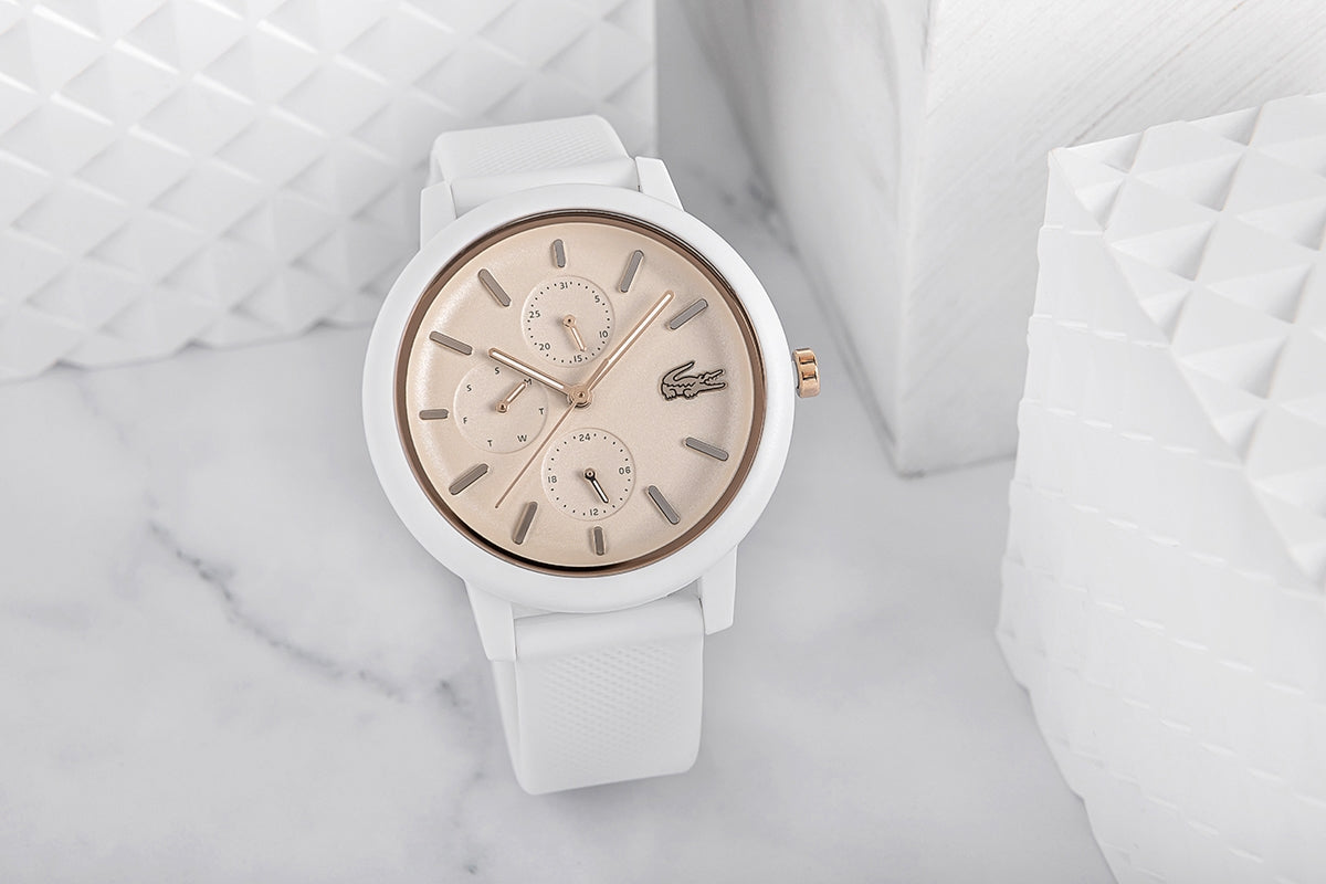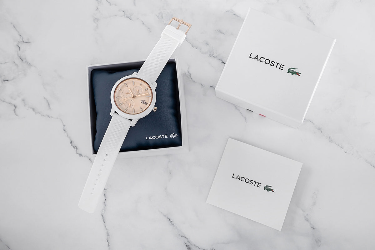 Kolekcja **Lacoste 12.12** to hołd dla ikonicznej koszulki polo Lacoste, która zrewolucjonizowała sportowy styl. Zegarki z tej serii przenoszą esencję marki na nadgarstek, łącząc sportową elegancję z nowoczesnym designem. Charakterystyczne, wyraziste kolory, proste linie oraz wyjątkowo lekkie, silikonowe paski nawiązują do komfortu i stylu koszulki polo, zapewniając wygodę noszenia i ponadczasowy wygląd. Każdy model Lacoste 12.12 wyróżnia się minimalistyczną tarczą z dyskretnym logo krokodyla, co czyni je idealnym wyborem dla kobiet ceniących subtelny, ale wyrafinowany styl na co dzień.