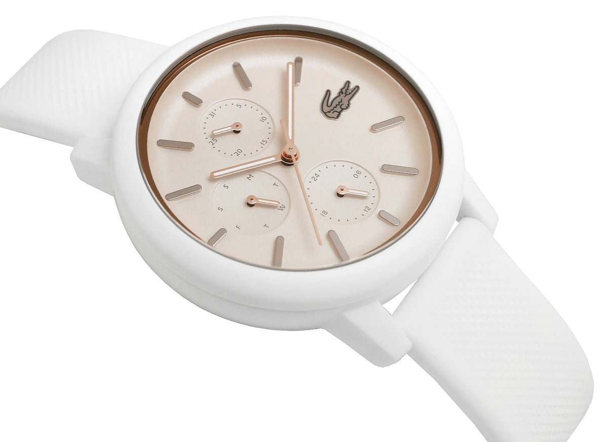 Biała koperta, czysta jak świeży płatek śniegu, to doskonała baza dla tarczy w metalizowanym odcieniu szampana, której subtelny połysk intryguje niczym bąbelki w kieliszku dobrego wina. Całość otula pierścień w różowym złocie, wprowadzając ciepło i kobiecość, jak delikatny muśnięcie różu na policzkach. To doskonały kontrast dla chłodnej bieli, który przyciąga spojrzenia jak magnes.Wskazówki i sekundnik, również w różowym złocie, krążą po tarczy niczym wirująca sukienka na parkiecie – eleganckie, a zarazem lekkie, z wdziękiem prowadzą przez każdą chwilę. Każdy ruch tych detali to subtelna symfonia precyzji i stylu, która nie pozwala oderwać wzroku. Biały, teksturowany pasek nie tylko zapewnia wygodę, ale też wprowadza nowoczesny twist, łącząc sportowy vibe z wyrafinowaną klasą. Sprawia, że ten zegarek idealnie balansuje między codzienną lekkością a szykowną elegancją. A te detale – logo Lacoste na godzinie trzeciej, koronka i sprzączka w różowym złocie – to prawdziwa biżuteria wkomponowana w czasomierz.