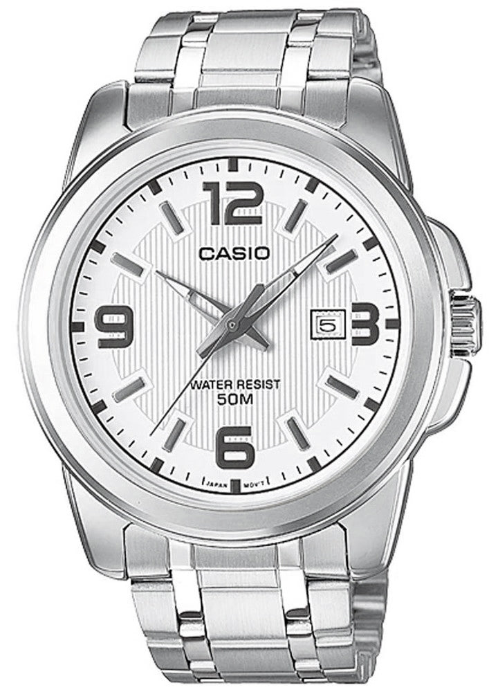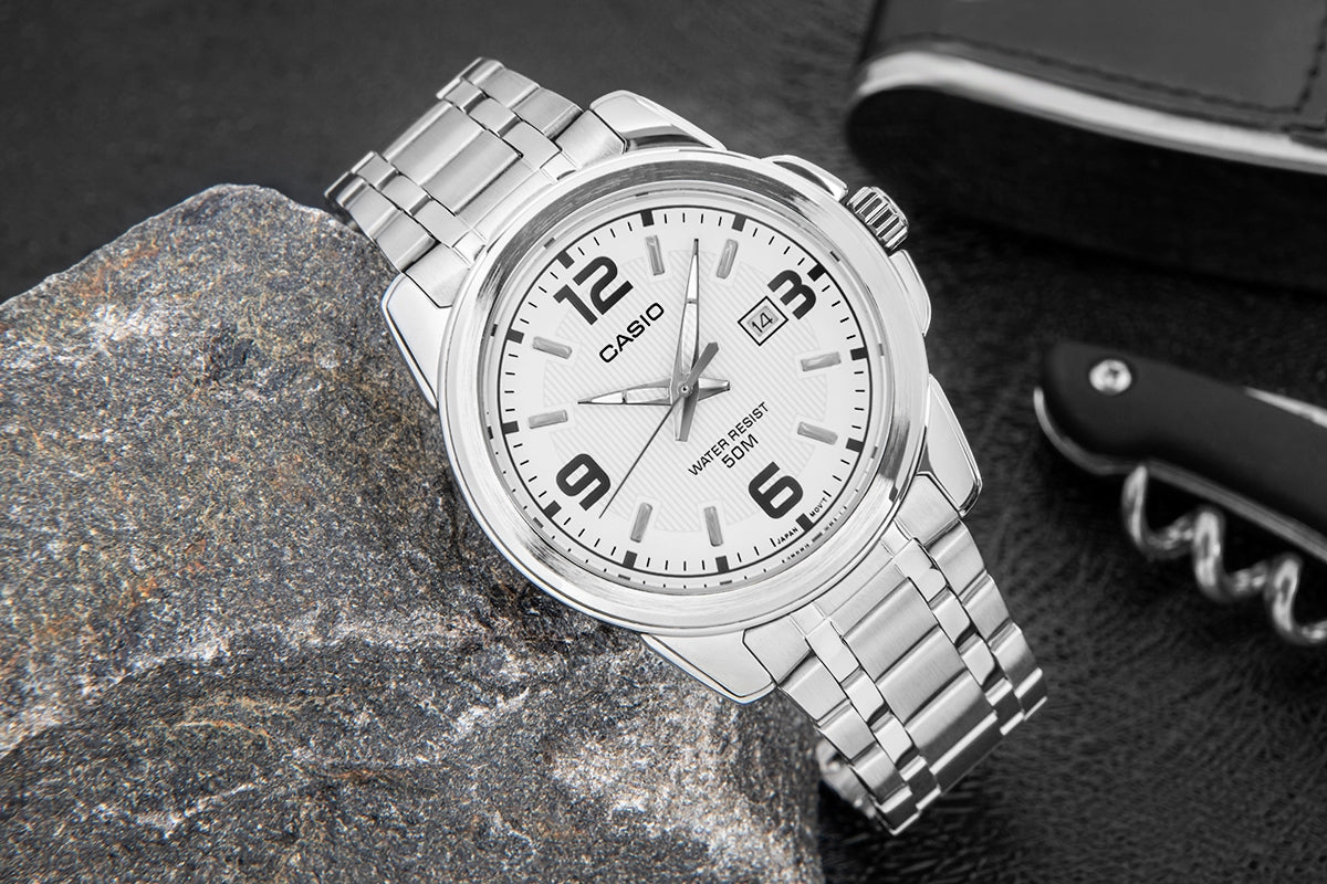 Ten elegancki męski zegarek łączy klasyczne proporcje z nowoczesnym wykończeniem. Jasna, srebrno-biała tarcza z subtelnym, pionowym żłobieniem nadaje całości świeżości i przejrzystości. Duże, ciemne cyfry arabskie na godzinach 12, 3, 6 i 9 gwarantują perfekcyjną czytelność, a smukłe wskazówki i indeksy idealnie wpisują się w estetykę nowoczesnego minimalizmu. Datownik przy godzinie trzeciej jest eleganckim dodatkiem, który nie zaburza harmonii projektu. Bransoleta oraz koperta wykonane z wysokiej jakości stali nierdzewnej zapewniają trwałość i komfort noszenia. Zegarek jest wodoodporny do 50 metrów, co czyni go doskonałym wyborem na co dzień – zarówno do pracy, jak i po godzinach. Casio MTP – dla mężczyzn, którzy cenią jasne zasady, czysty design i niezawodność.