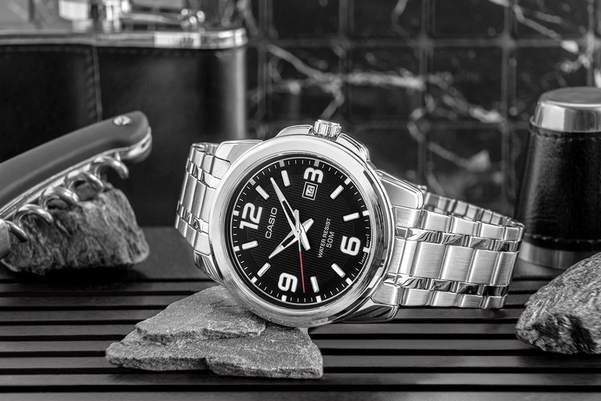 Model CASIO MTP-1314PD-1AVEF łączy w sobie ponadczasowy design z codzienną praktycznością. Czarna tarcza z delikatną teksturą i wyraźnie zaznaczonymi indeksami oferuje doskonałą czytelność. Duże cyfry arabskie na godzinie 12, 3, 6 i 9 w połączeniu ze smukłymi wskazówkami tworzą nowoczesną kompozycję, podkreśloną przez subtelny czerwony sekundnik. Datownik umieszczony na trzeciej godzinie dodaje funkcjonalności, nie zakłócając harmonii projektu. Stalowa koperta i bransoleta o satynowym wykończeniu nadają zegarkowi elegancji, która sprawdzi się zarówno w biurze, jak i na co dzień. Wodoodporność do 50M zapewnia niezawodność w różnych warunkach. Casio MTP – wybór mężczyzny, który stawia na solidność, styl i ponadczasową estetykę.