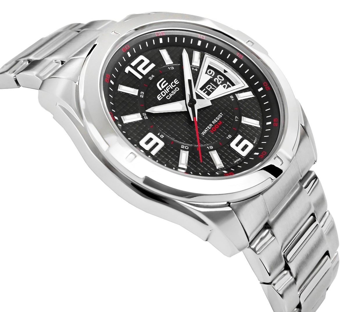 ten model CASIO EDIFICE zarabiasz topowy zegarek męski, który spełnia wymagania. Nowoczesny układ z karbowaną czarną tarczą uzupełnioną o datownik i czerwone detale podkreślające inteligentny charakter zegarka, połączenie funkcji z wbudowanym designem. Wodoszczelność 10 BAR pozwala na dostęp do wody, a fluorescencyjne podświetlenie dostępu nawet po zmroku. Logo EDIFICE wytłoczone na koronce, deklu i zapięte.