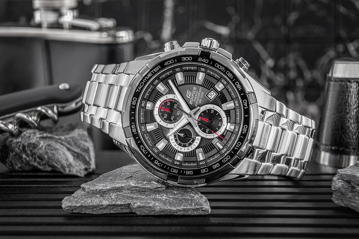 CASIO EDIFICE przewyższa swoją wszechstronność. Bez względu na, czy postawisz na klasyczny model ze stalową bransoletką, sportowy wariant z widocznymi paskami, czy elegancką wersję na pasku ze skóry indywidualnej – każdy EDIFICE na nadgarstku łączy styl sportowy z wyrafinowanym wyglądem.