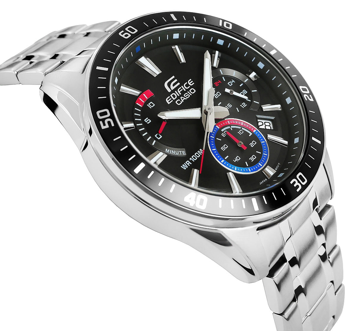 Duży, standardowy chronograf EDIFICE z retrogradą umieszczoną na pozycjach 10. Sportowy charakter zegarków czerwonych i niebieskich akcentów, które efektownie kontrastują z czarną ramką i tarczą. funkcjonowanie w datach dni miesiąca oraz chronografy: stoper sekund, minut oraz chronograf 24h. Dzięki wodoszczelności 10 BAR możesz śmiało przejść na basen, trening lub wodną pochodną, a fluorescencyjne podświetlenie sprawia, że nawet po zmroku masz pełne wykorzystanie nad wystąpienie.