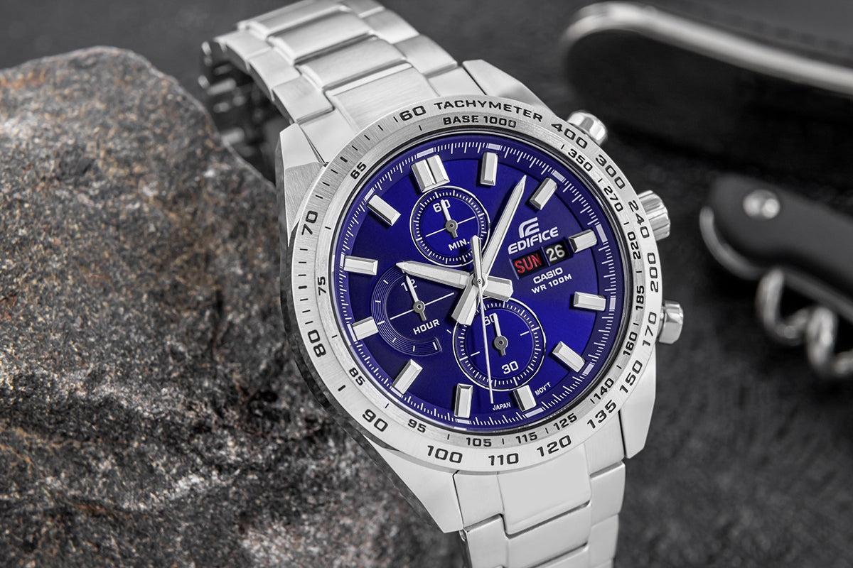 Postaw na dynamiczny, klasyczny styl – klasyczny chronograf EDIFICE z myślą o sportowym charakterze. Efektywnie wykończona, głęboka niebieska tarcza nadaje zegarkowi wyrazisty charakter. Wskaźnik dnia i daty aktualizacji praktyczności, powoduje, że zegarek jest nie tylko stylowy, ale i funkcjonalny na co dzień. Dzięki wodoszczelności 10 BAR możesz śmiało przejść na basen, trening lub wodną wersję, a fluorescencyjne elementy powodujące, że nawet po zmroku masz pełne uruchomienie nad możliwością.