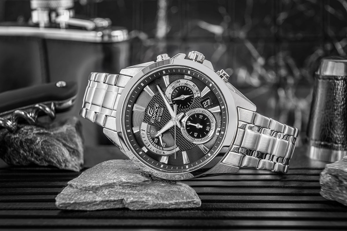 CASIO EDIFICE przewyższa swoją wszechstronność. Bez względu na, czy postawisz na klasyczny model ze stalową bransoletką, sportowy wariant z widocznymi paskami, czy elegancką wersję na pasku ze skóry indywidualnej – każdy EDIFICE na nadgarstku łączy styl sportowy z wyrafinowanym wyglądem.