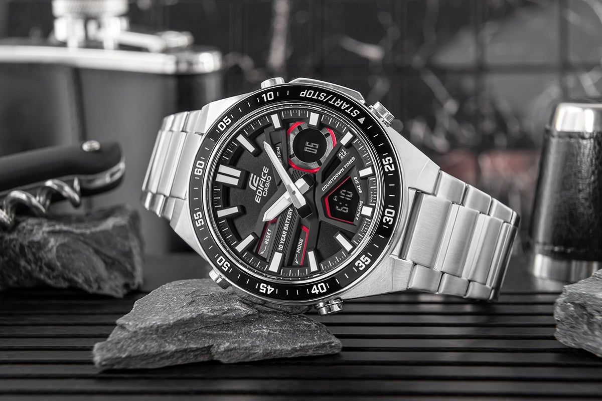 CASIO EDIFICE przewyższa swoją wszechstronność. Bez względu na, czy postawisz na klasyczny model ze stalową bransoletką, sportowy wariant z widocznymi paskami, czy elegancką wersję na pasku ze skóry indywidualnej – każdy EDIFICE na nadgarstku łączy styl sportowy z wyrafinowanym wyglądem.
