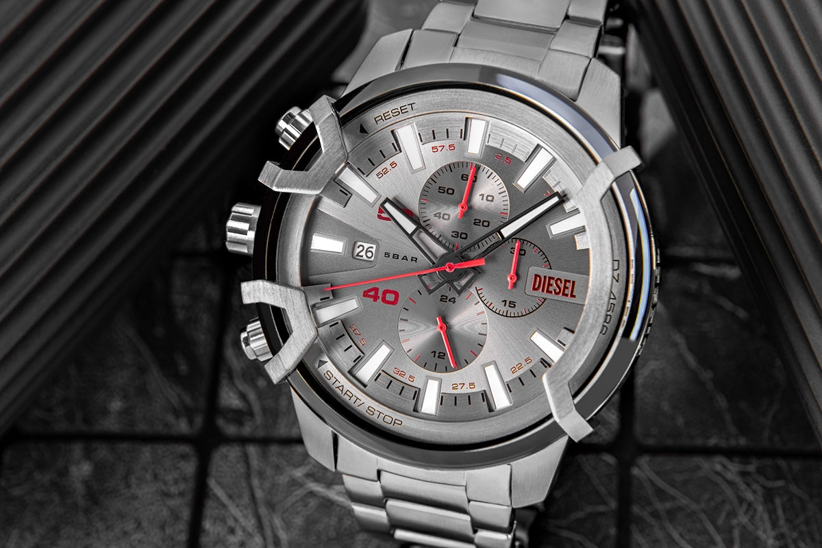 Srebrzystoszary odcień z delikatnym, szczotkowanym wykończeniem polimerowym, który wykorzystuje moc detali. Wyraziste, czerwone akcenty na wskazówkach i subtarczach, które niosą ze sobą dynamikę i funkcję, zegarek był gotowy na każdą akcję. Wysokie indeksy i elementy wystające z powierzchni tarczy, jej trójwymiarowego charakteru, solidność i głębię projektu. Dzięki powłoce luminescencyjnej na wskazówkach i indeksach odczytu czasu jest nawet w słabym świetle, co zwiększa praktyczność modelu. Maszynowy napis DIESEL wygrawerowany z boku koperty to detal, który zawiera wiele cech tego modelu – surowy, bezkompromisowy, gotowy do podjęcia najbardziej wymagających działań mężczyzn.